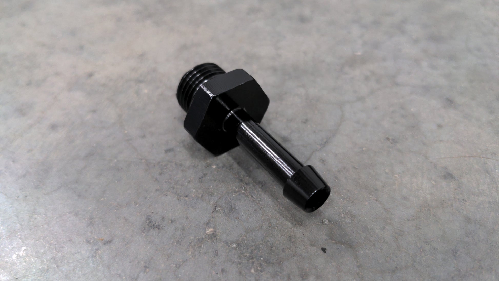 1) -6 AN ORB 3/8" Barb in black or clear anodizing to match or contrast your Vapor Trapper. The 3/8" inch fittings are our primary recommended sizing. Please using 3/8" I.D. fuel hose with this application.